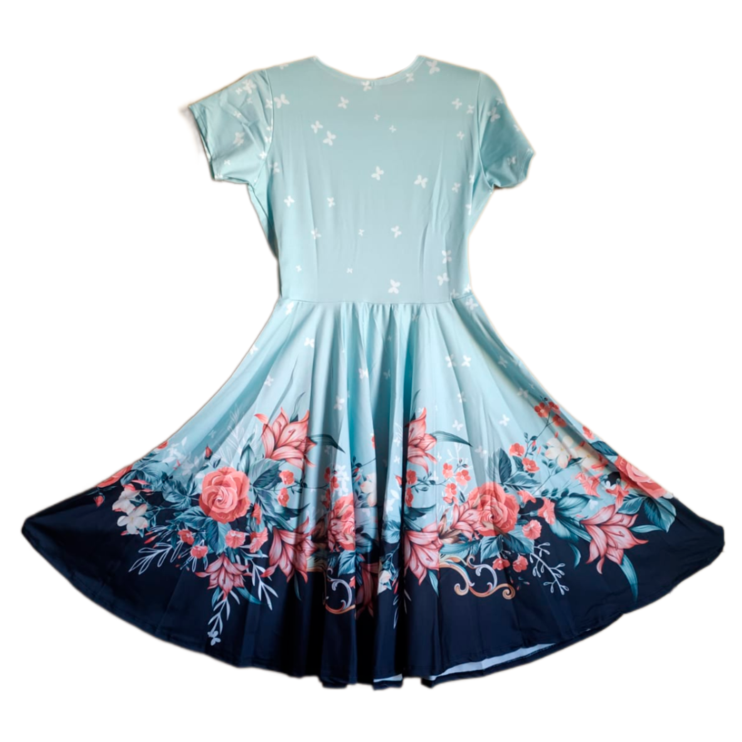 Apresentamos o Vestido Feminino Midi Godê Florido com Detalhes de Borboleta e Cinto de Poliéster.